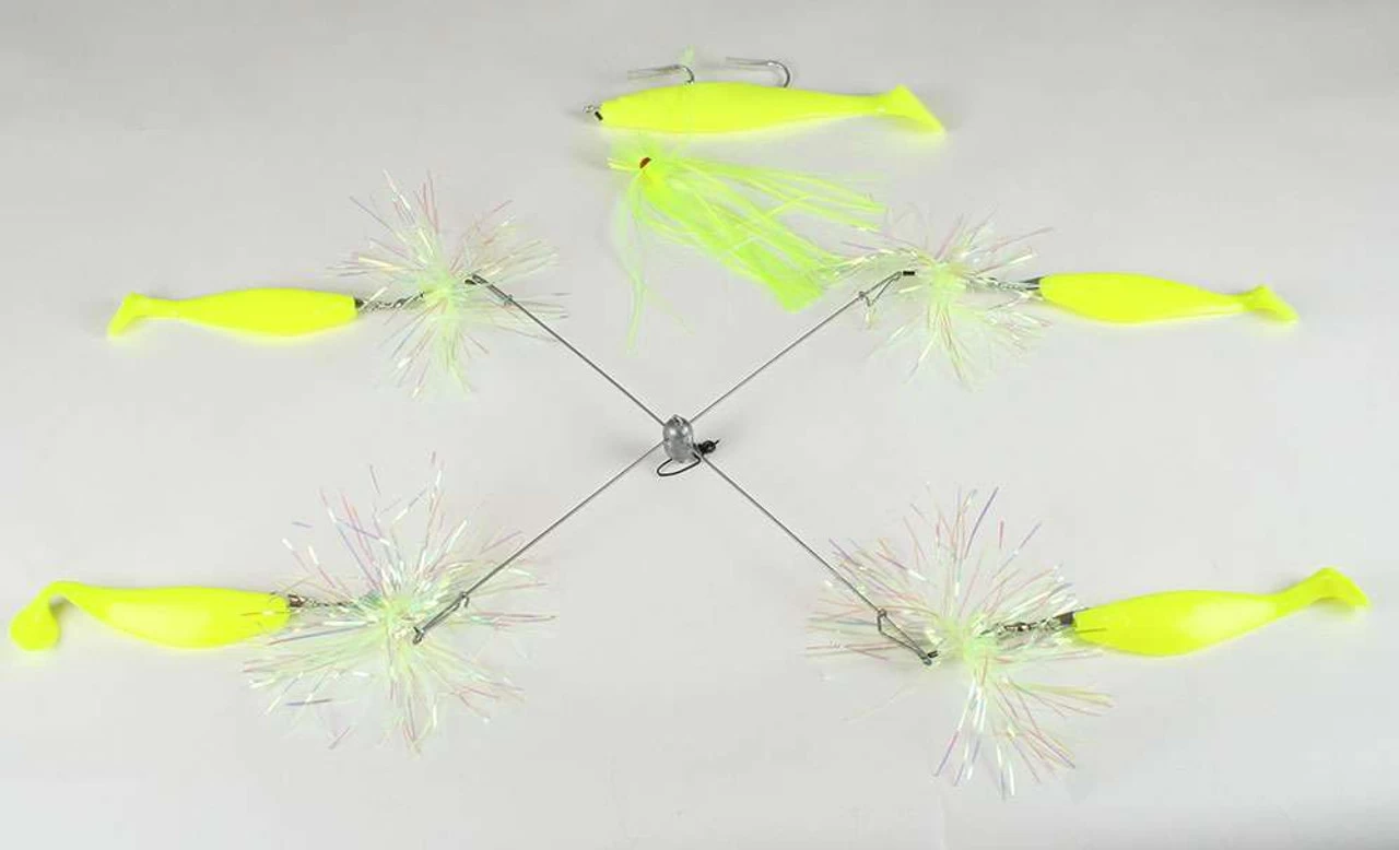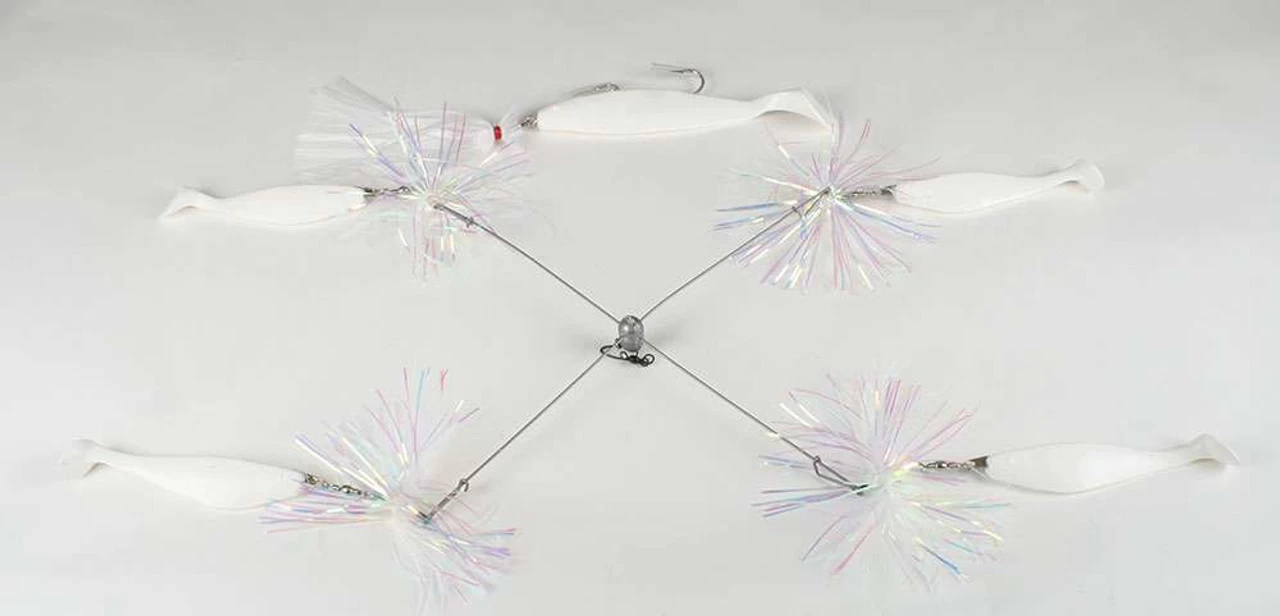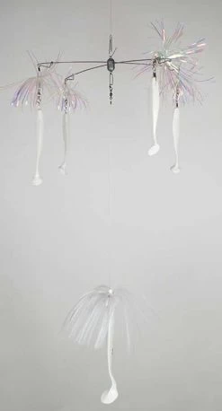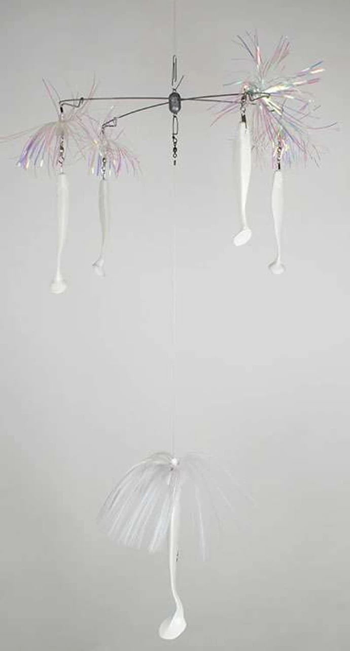 The Blue Water Candy Striperbella with 9in Chaser is a 15? weighted umbrella with 4 skirted 6? shad with feather weight teasers and a 9″ shad chaser with 1/2oz. skirt trailing behind. Designed for saltwater fishing.