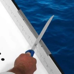 The Cuda 18218 Marine Cutting Board Channel Sharpener is diamond plated with a fine grit for all purpose edge restoration and fits right on the back edge of your marine cutting board.