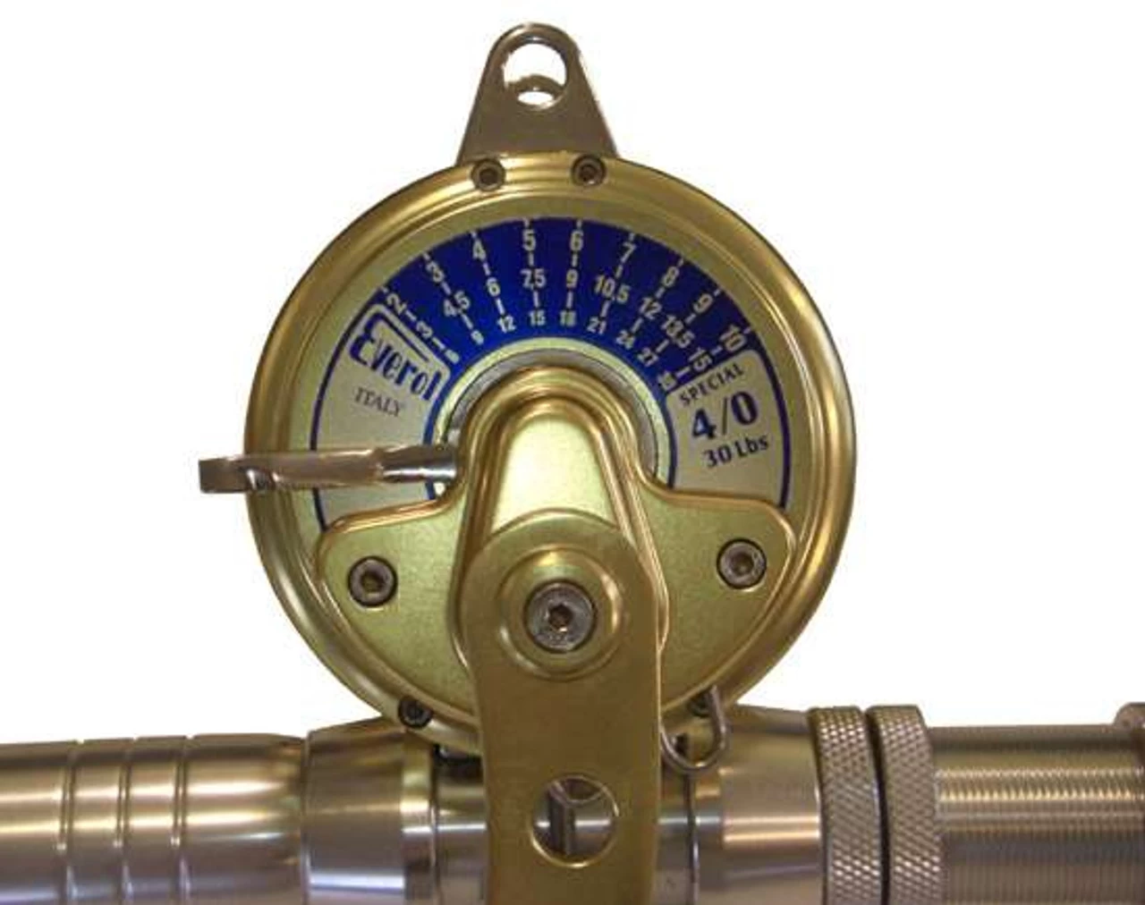 - Traditional Everol drag system with a graduated scale on a striking blue side plate.