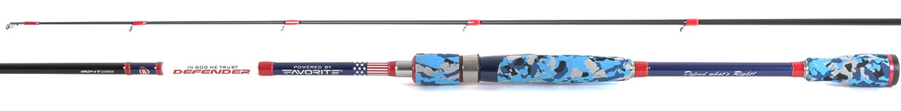 Tough enough to be tossed in the truck and boat, but sensitive enough to feel even the softest of bites, the Powered By Favorite Defender Spinning Rods were designed for the everyday American fisherman. The Defender features a patriotic color scheme that you can’t miss, but it’s more than just a show piece. It is built around an IM24T carbon blank constructed with Favorite’s Multi Layer Structure technology. These blanks are produced from a layering process where carbon of different modulus and different fiber directions are strategically layered on top of one another to achieve the desired rod action, increase durability, and lower weight. Favorite has also added their FX Grid technology to the mix where an x-like carbon tape is wrapped throughout the butt and middle sections of the blank for increased rod power. These rods are fitted with Fuji SiC guides and blue camoflauge EVA split grips.