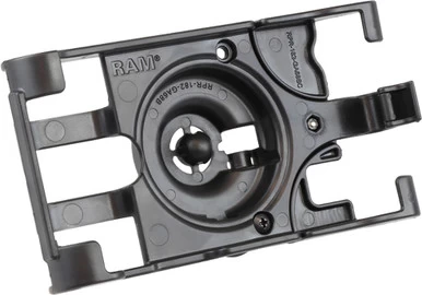 The cradle allows for full range of motion of the device camera and integrates the factory Garmin magnetic dock for access to charging. The high-strength composite mount integrates a cable retention system to prevent accidental unplugging. The custom-fit cradle also has a locking option that is installed using press-fit nuts to enhance security. The cradle has two location options to attach the RAM ball (comes with 1″ B-Size ball).